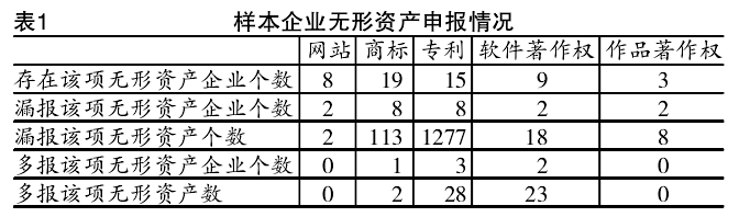 表1列示了采用资产基础法进行企业价值评估的样本企业中知识产权无形资产申报的具体情况。根据评估报告示列的知识产权无形资产数量与天眼查(国家中小企业发展基金旗下官方备案企业征信机构)系统的对比,截止评估基准日,24家详细示列被评估无形资产的企业中有17家企业申报的知识产权无形资产数量与天眼查数据不符,占比70%。其中,有15家企业无形资产中某些项目申报数量少于天眼查系统显示数,涉及无形资产漏报问题。其中商标权与专利权被漏报数量偏多,而专利权的漏报项目又多于商标权,共涉及8家企业1277项专利权无形资产未在评估中申报;有4家企业无形资产中某些项目申报数多于天眼查系统显示数据,反映出混改中国有企业的无形资产信息披露存在一定不足。另外,除表内无形资产存在信息披露不准确的问题外,表外资产也存在一定的漏报风险。企业的表外资产往往涉及大量无形资产,而40份样本报告中有12份报告并未对表外资产进行有关说明。